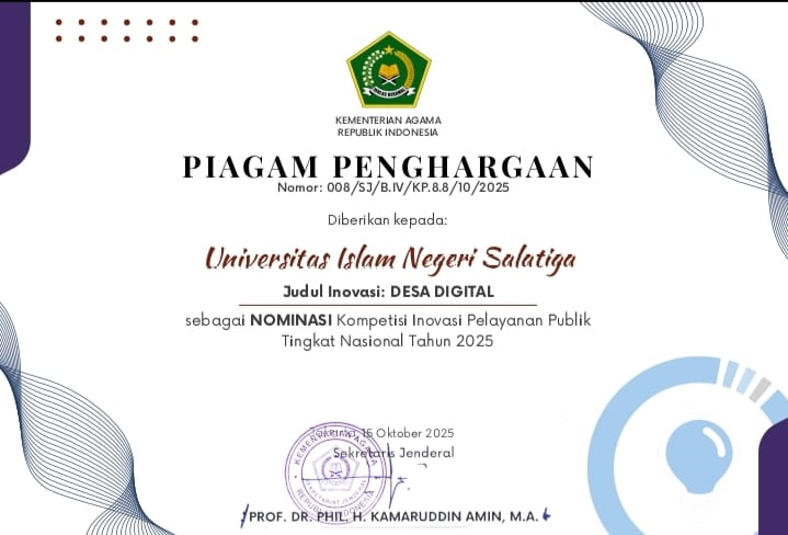 Salatiga – Universitas Islam Negeri (UIN) Salatiga kembali menorehkan prestasi di tingkat nasional dengan meraih Nominasi dalam Kompetisi Inovasi Pelayanan Publik Tingkat Nasional Tahun 2025 yang diselenggarakan oleh Kementerian Agama Republik Indonesia. Penghargaan ini diberikan atas inovasi UIN Salatiga berjudul “DESA DIGITAL”. Piagam Penghargaan dengan Nomor: 008/SJ/B.IV/KP.8.8/10/2025 ini ditetapkan pada 25 Oktober 2025 dan ditandatangani oleh Sekretaris Jenderal Kementerian Agama, Prof. Dr. Phil. H. Kamaruddin Amin, M.A..