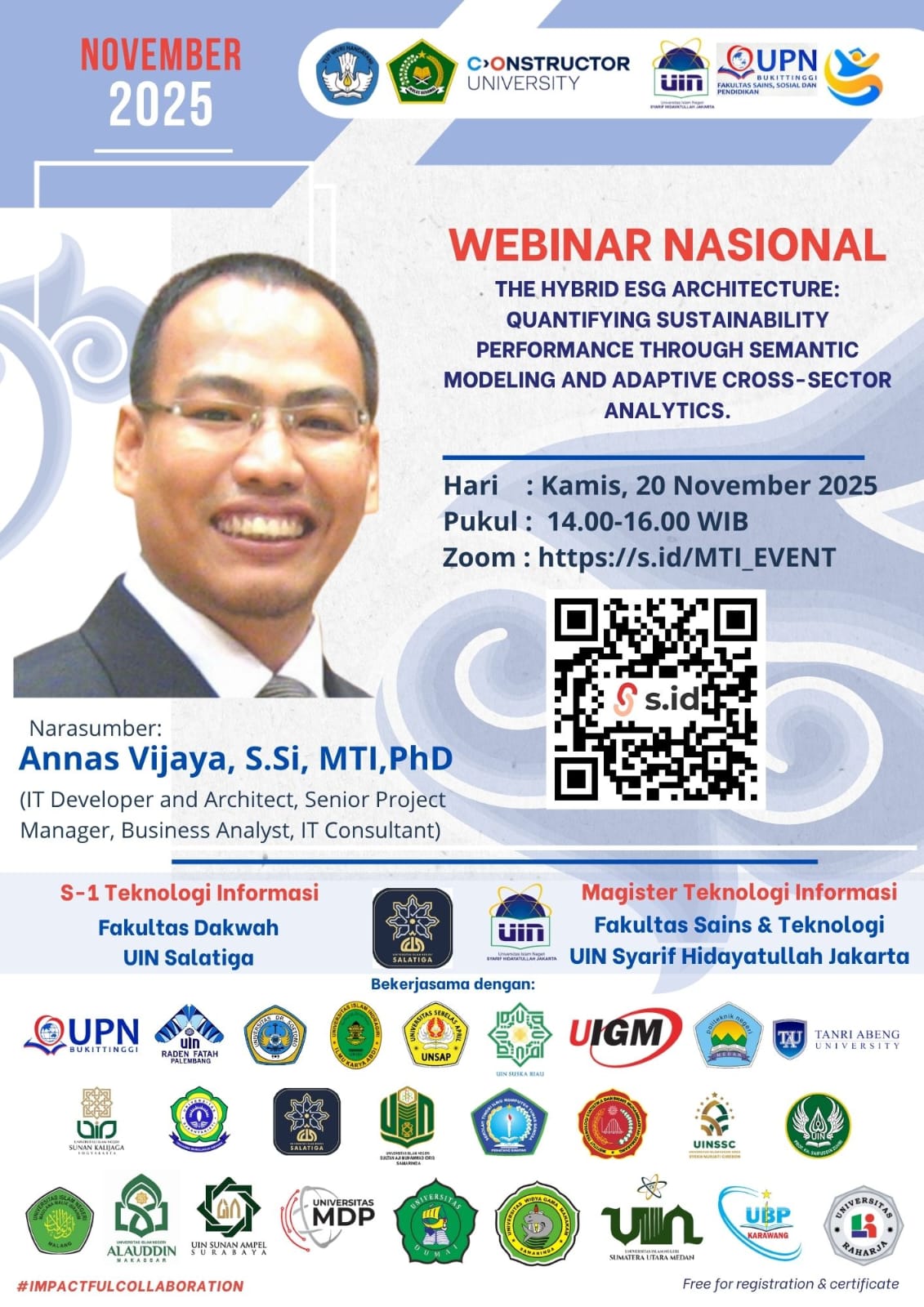 Salatiga, 21 November 2025 – Sebuah event akademik berskala besar, Webinar Nasional dengan tajuk “The Hybrid ESG Architecture: Quantifying Sustainability Performance Through Semantic Modeling and Adaptive Cross-Sector Analytics”, telah sukses diselenggarakan pada hari Kamis, 20 November 2025. Acara ini merupakan wujud kolaborasi luar biasa yang melibatkan sedikitnya 30 program studi (Prodi) dari 26 perguruan tinggi di seluruh Indonesia, termasuk di dalamnya Prodi S-1 Teknologi Informasi Fakultas Dakwah UIN Salatiga.